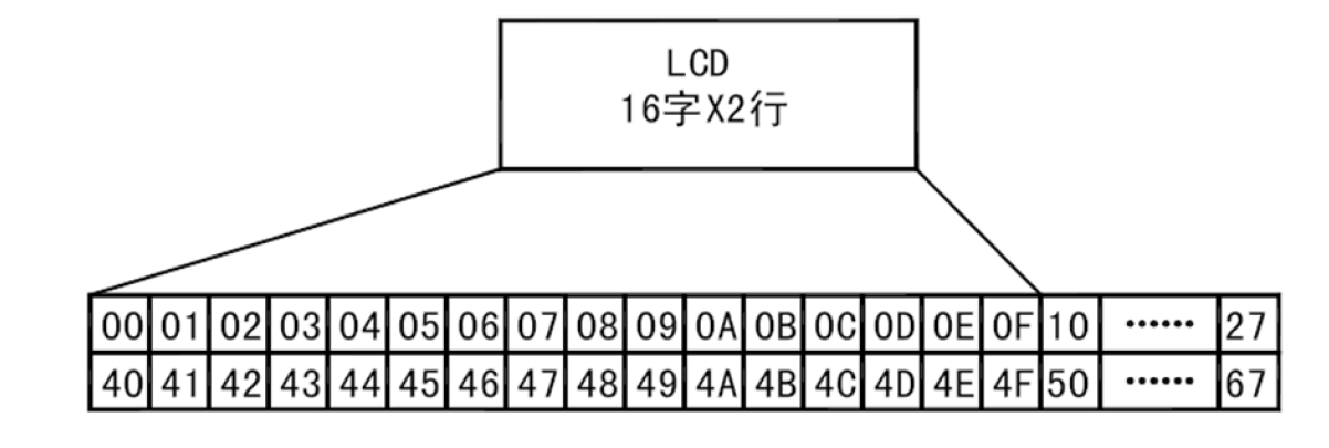 1602LCD的控制器显存有80个byte,而1602LCD只有两行X16字符的显示区域,所以显存中有些地址是无法对应上LCD屏幕的,但是可以预先保存在显存中,通过 移位操作进行显示,下图为显存地址对应图: