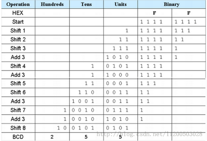 在FPGA中,寄存器定义和存储的数据都是采用二进制的格式,而FPGA输 出给数码显示管的数据必须是十进制的格式,所以需要一个专门把二进制数据转 换为十进制BCD码的模块。图3为以十进制255举例的转换算法,具体算法流程为: